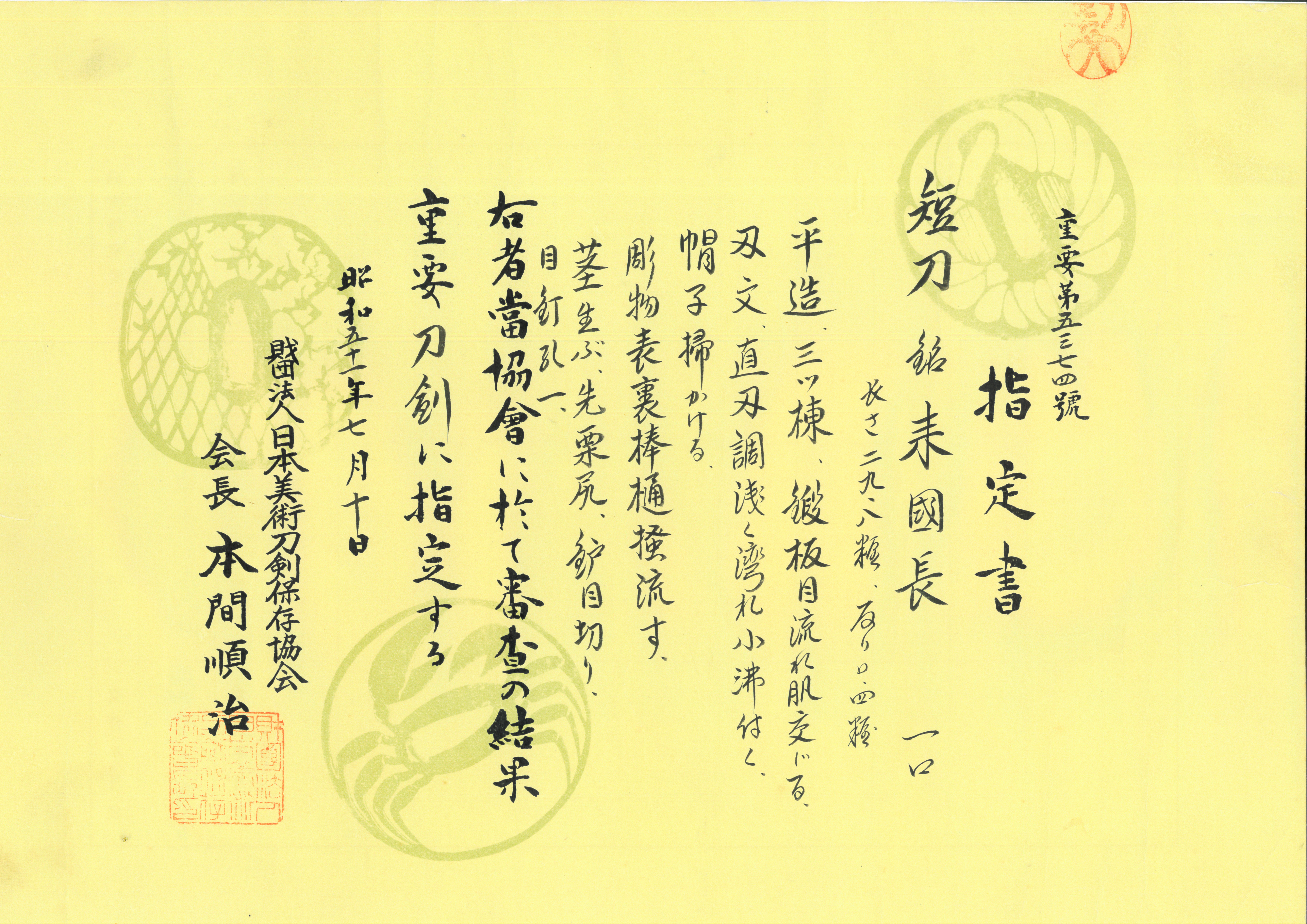 The blade is rated “Juyo” by the NBTHK, indicating not only extremely high craftsmanship and preservation over seven centuries, but also particular interest as a blade which contributes to the history of the Japanese sword through its existence.