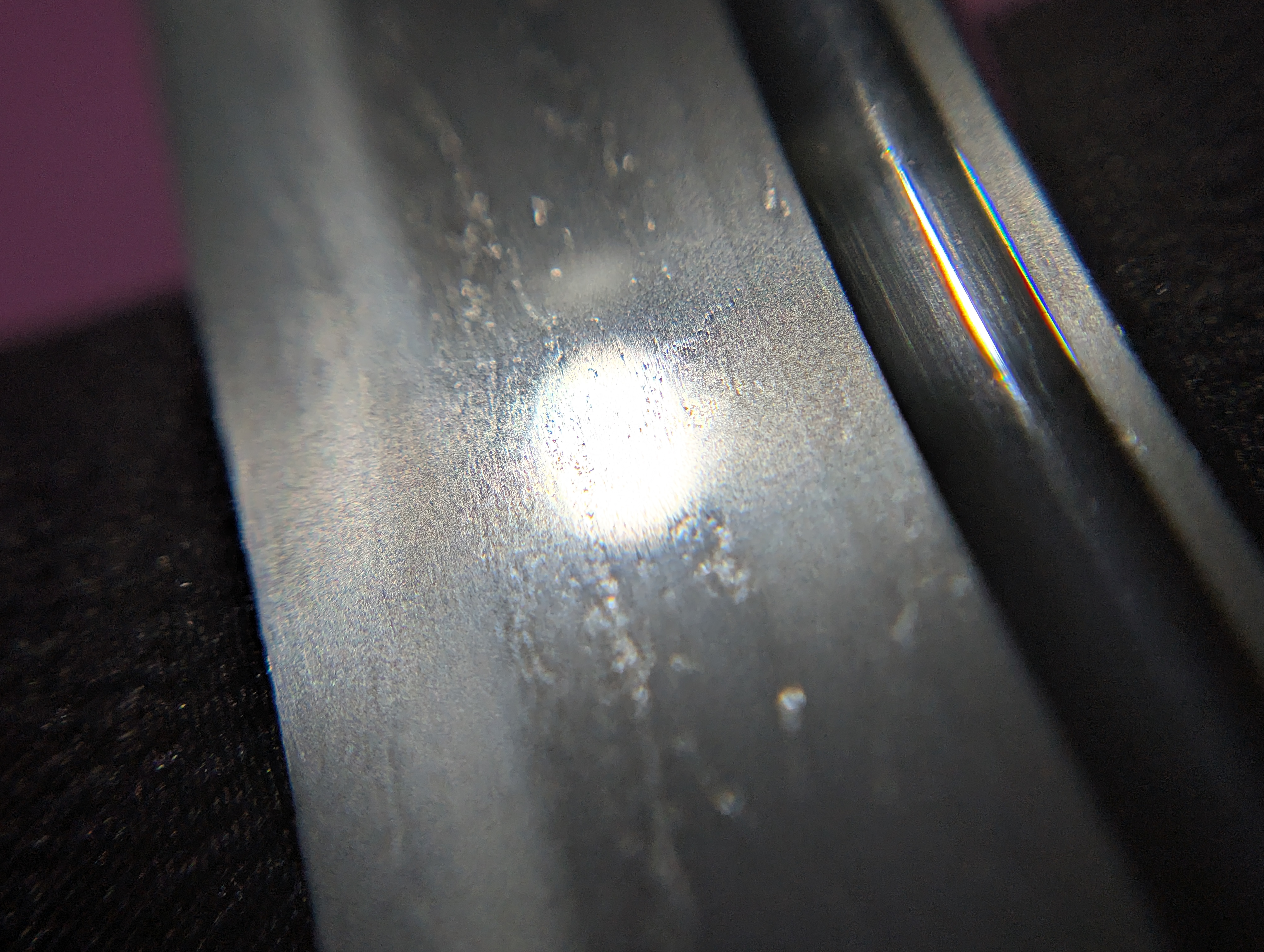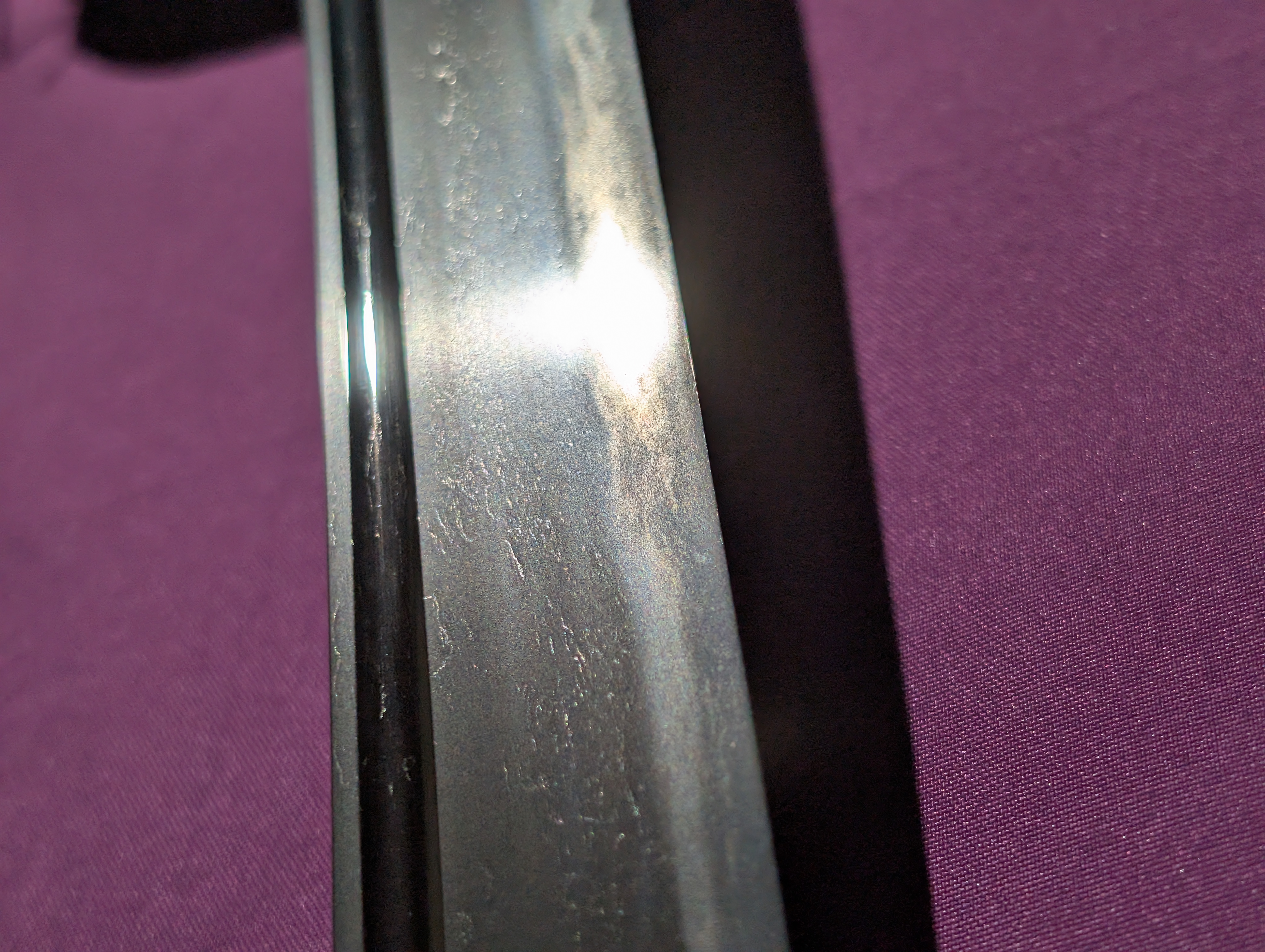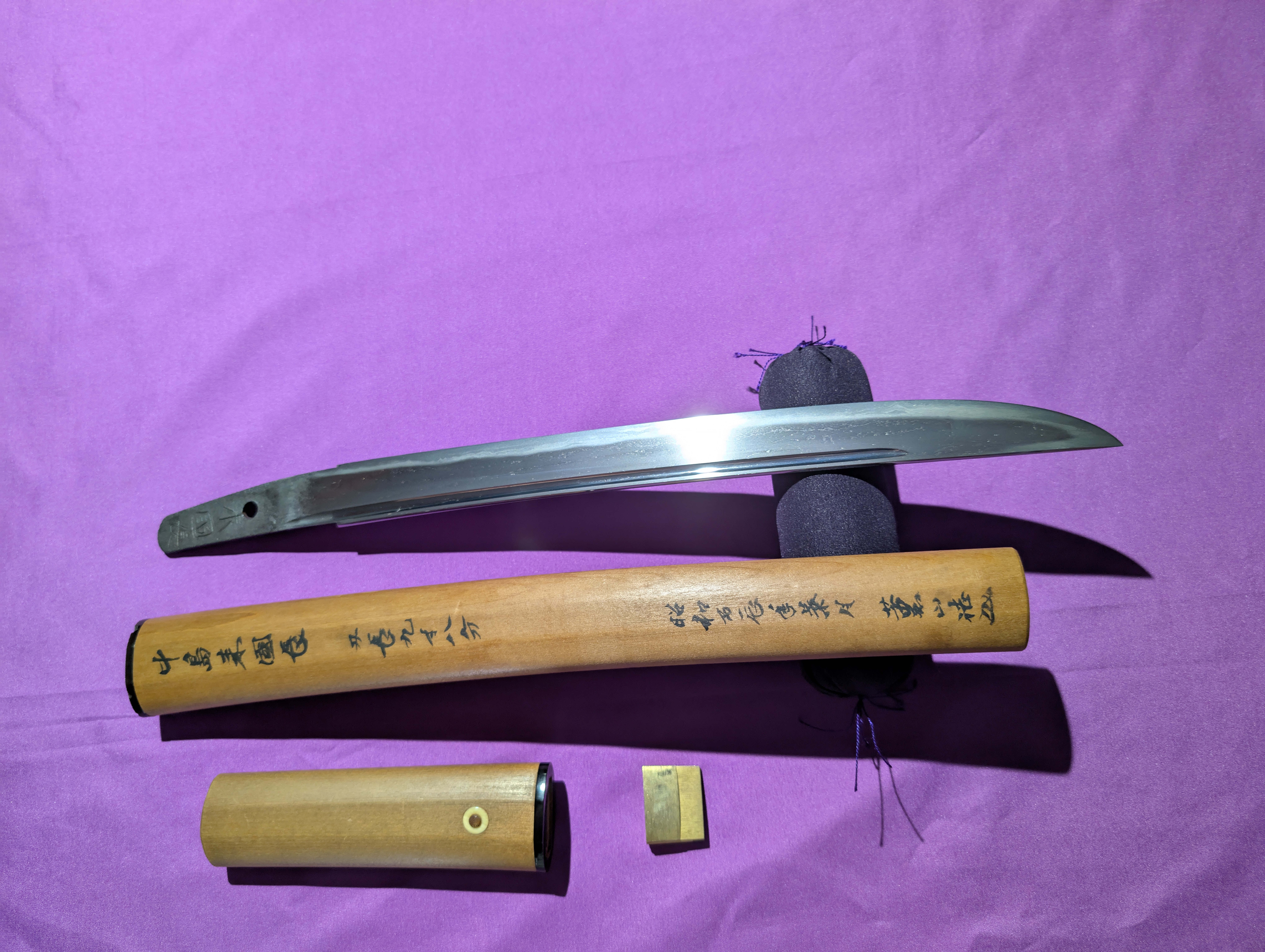 Included with this blade is a modem set of aiguchi tanto koshirae crafted with accessories from the Meiji Period. The saya is coated with a gorgeous golden lacquer with black speckles. The gold lacquer swirls in a circular motion, overlapping in a pattern which mimics the ripples seen in water after a morning dew.