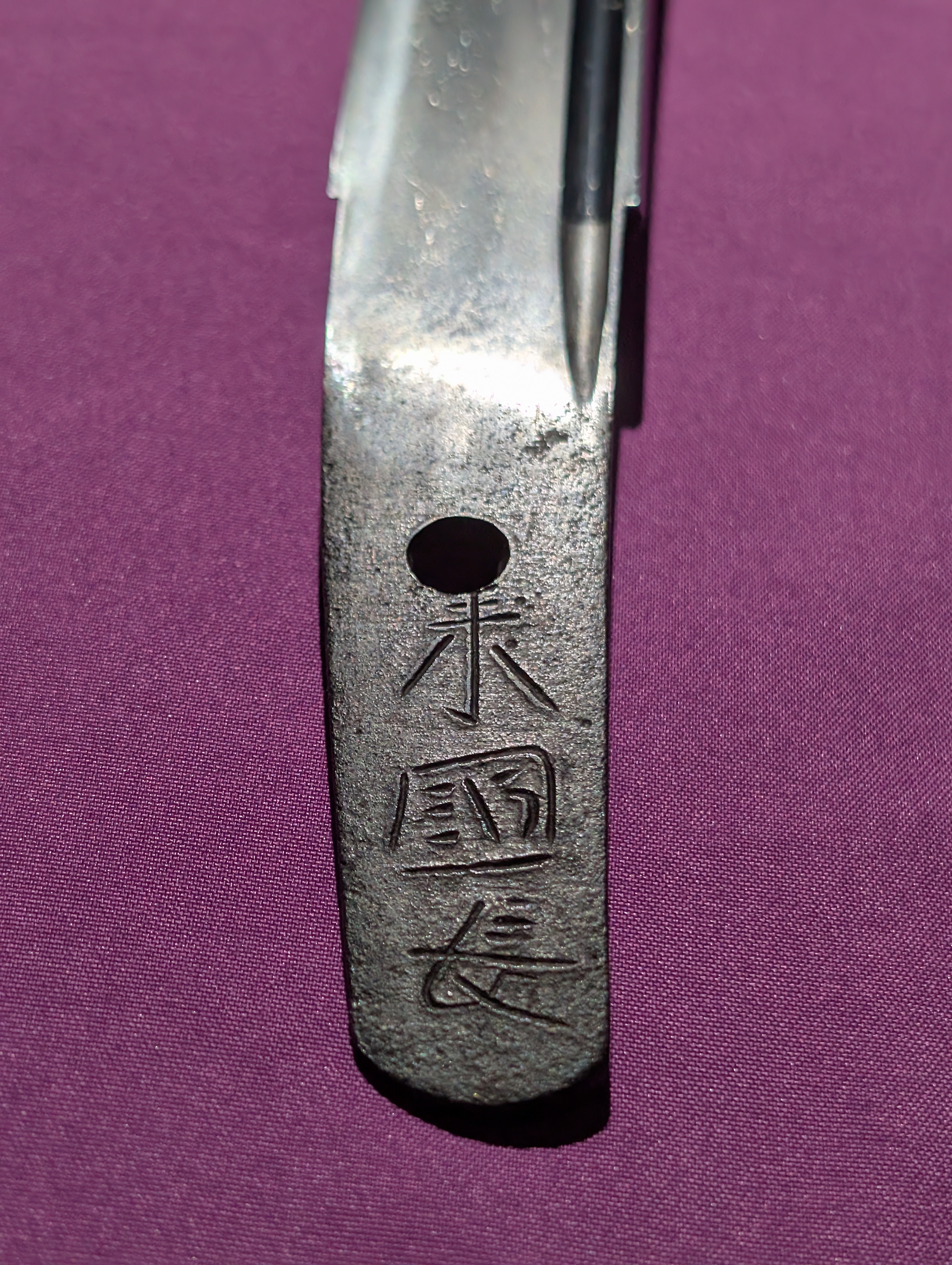 The nakago of the blade is ubu with a kurijiri tip. On the tanto-omote, the sanji-mei signature “Rai Kuninaga” (来国長) is finely chiselled. There is a single mekugi-ana.