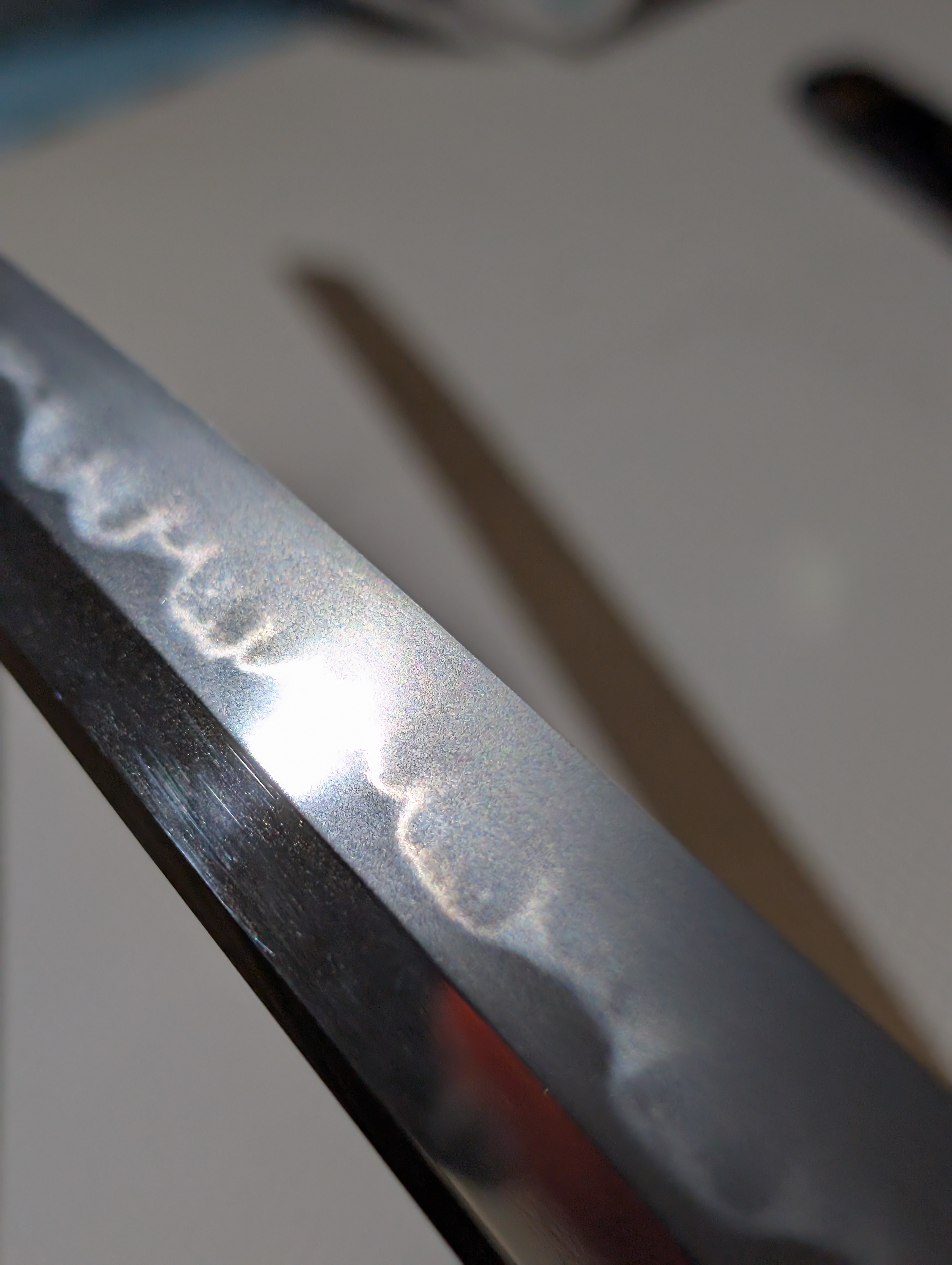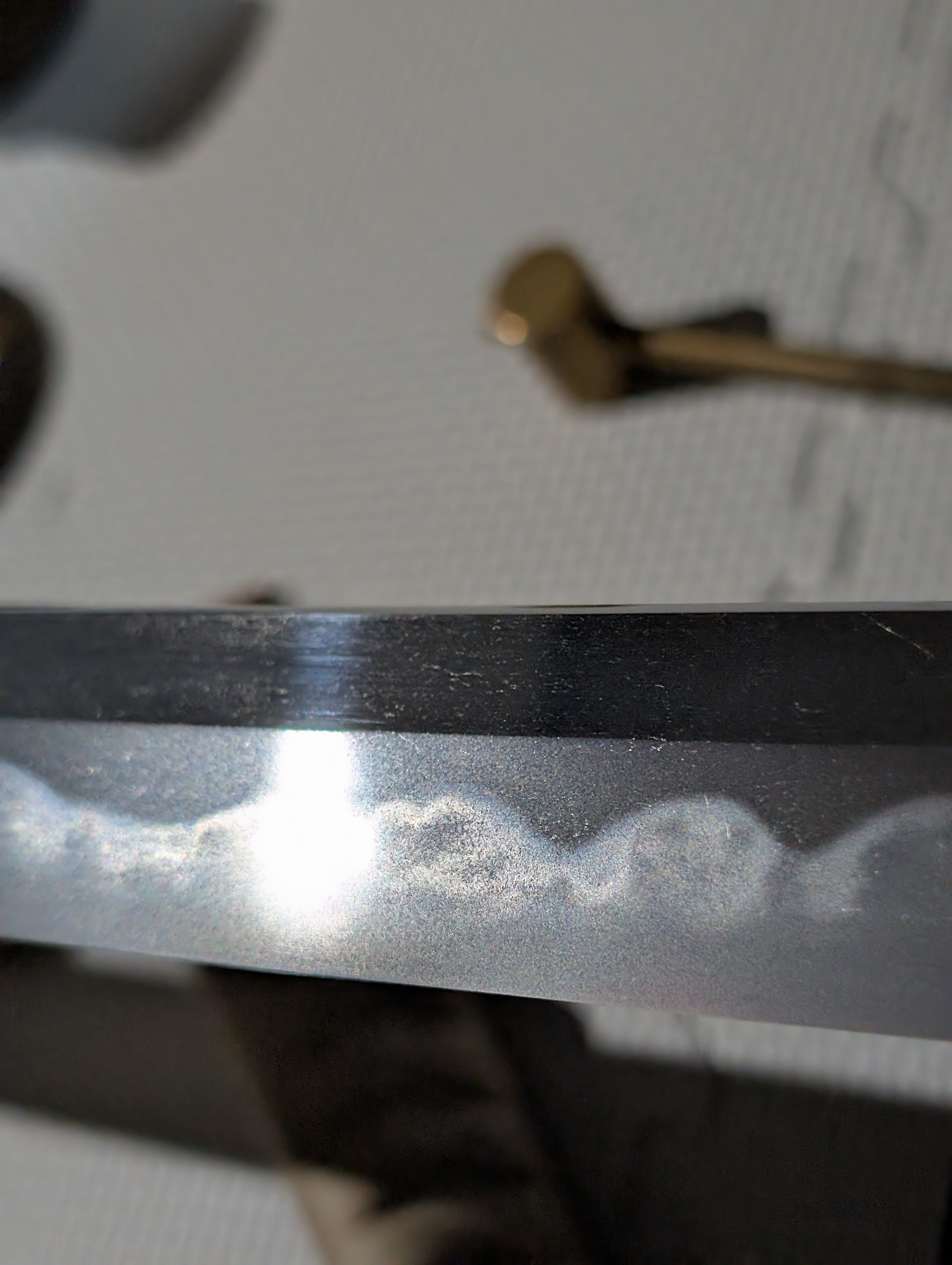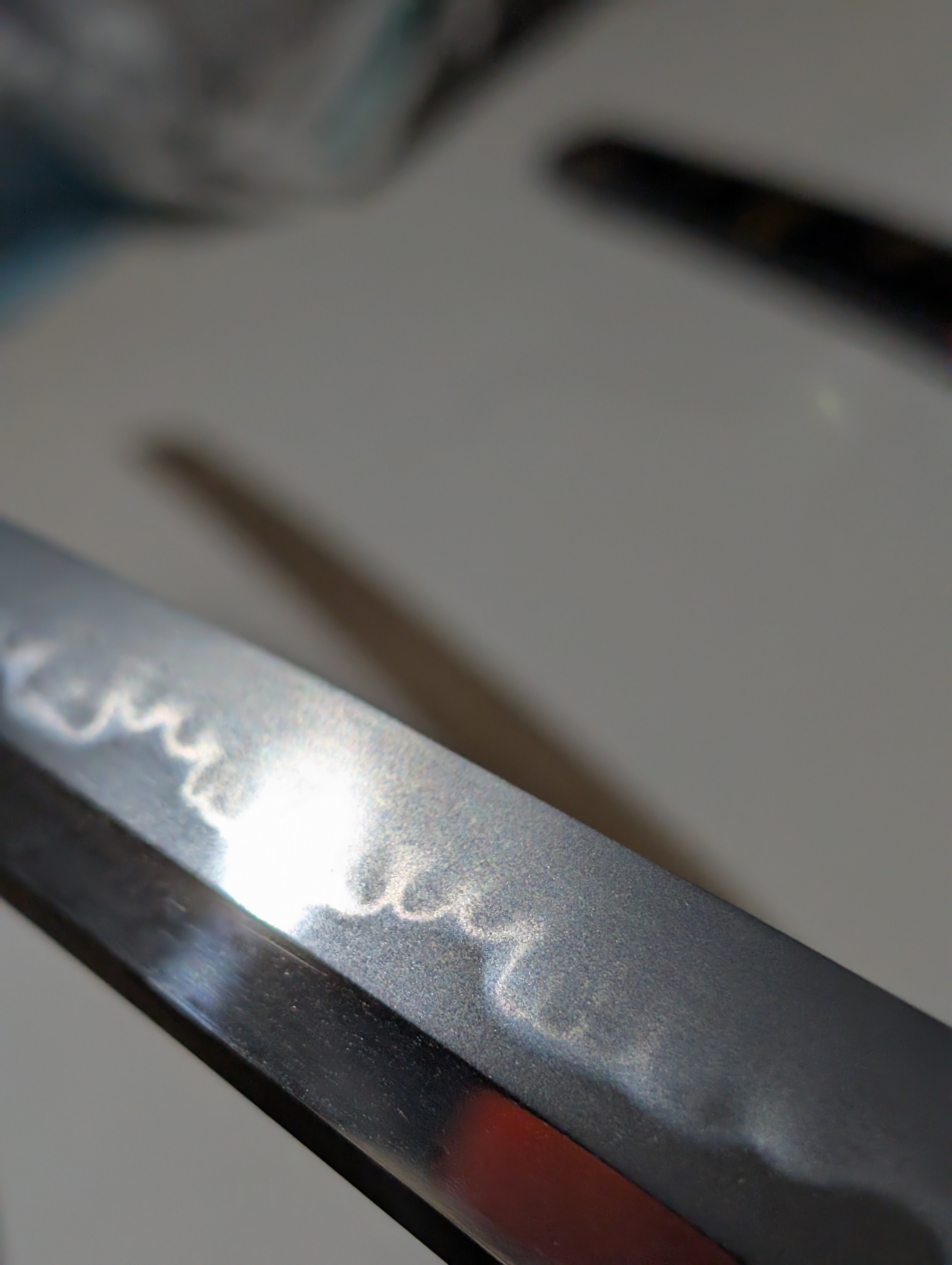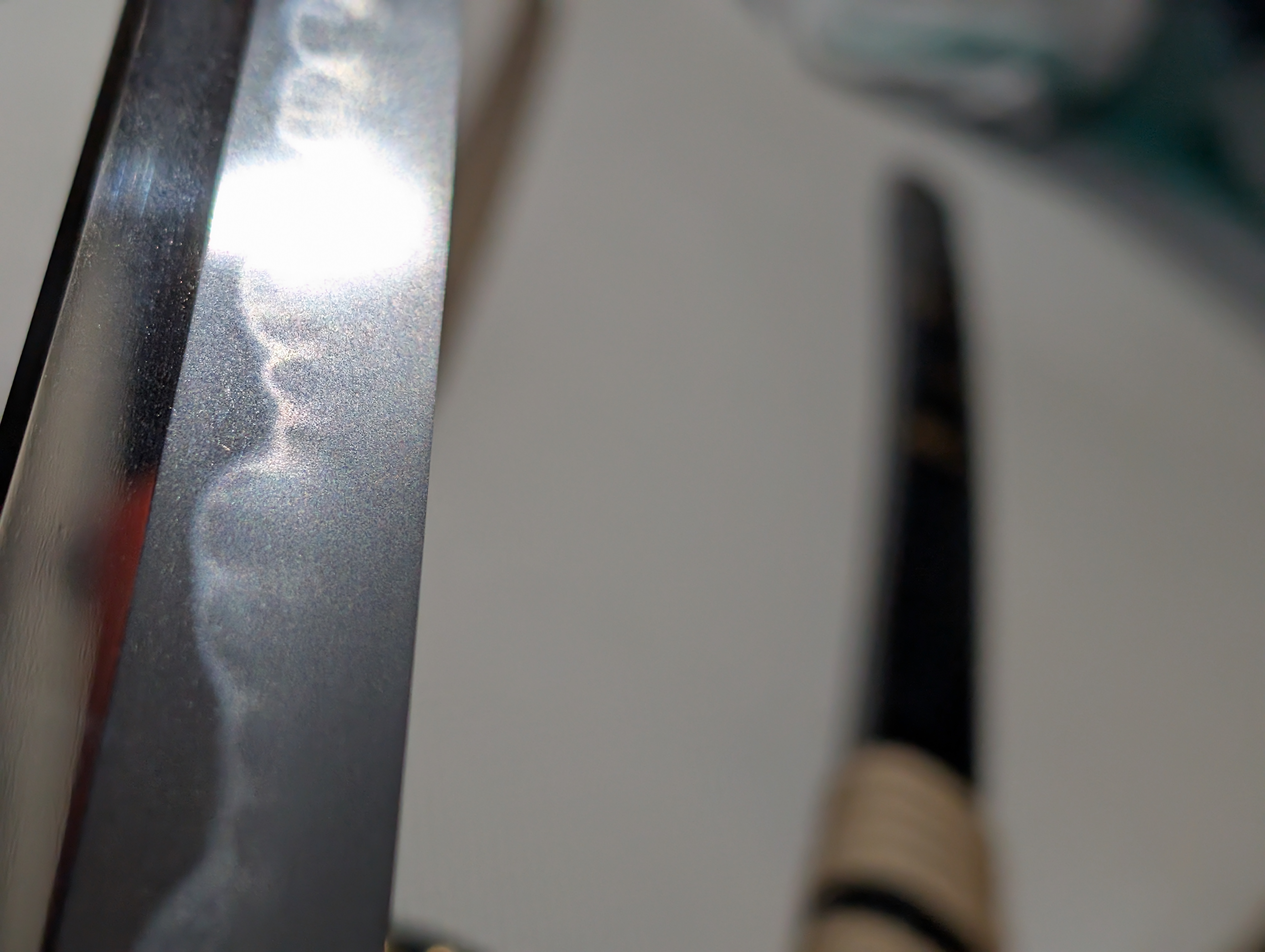 As the Azuchi-Momoyama Period came to an end and the Tokugawa Shogunate aggressively wrestled power from the Toyotomi at the Battle of Sekigahara, the unification of Japan under one banner brought about a 250-year-long period of widespread peace. A fortunate byproduct of this was the revival of artisanal Japanese swordsmithing, seeing two major eras, being the Keicho Shinto and Kanbun Shinto times. Today’s article will analyze one of the greatest smiths of the latter era through an uchigatana by a direct descendant of Kawachi no Kami Kunisuke’s pedagogy, Higo no Kami Kuniyasu. The blade itself is stunning, displaying the typical dimensions ofKanbun Shinto works, those being a more stout geometry, robust width, and a shallow, forward-facing saki-sori. Looking to the metallurgy of the blade, the grain formation is a tight ko-itame hada throughout the blade. Ji-nie is abundant, resulting in an extremely bright jiba, as is seen in Shinto era swords. The temper follows the flamboyance of the era, starting suguha near the hamachi, but quickly shifting to tall gunome and, most prominently, kobushigata choji midare along the center of the blade to the monouchi, which is a major feature of Kunisuke School blades. The hamon is in nioi deki, causing nie-based hataraki, including ashi, kinsuji, and sunagashi to appear more clearly. This more grandiose hamon travels into the kissaki, where it ends in a similarly pronounced midare-komi boshi. With the discussion of the sword’s workmanship concluded, relevant measurements are listed below for the sake of clarity.