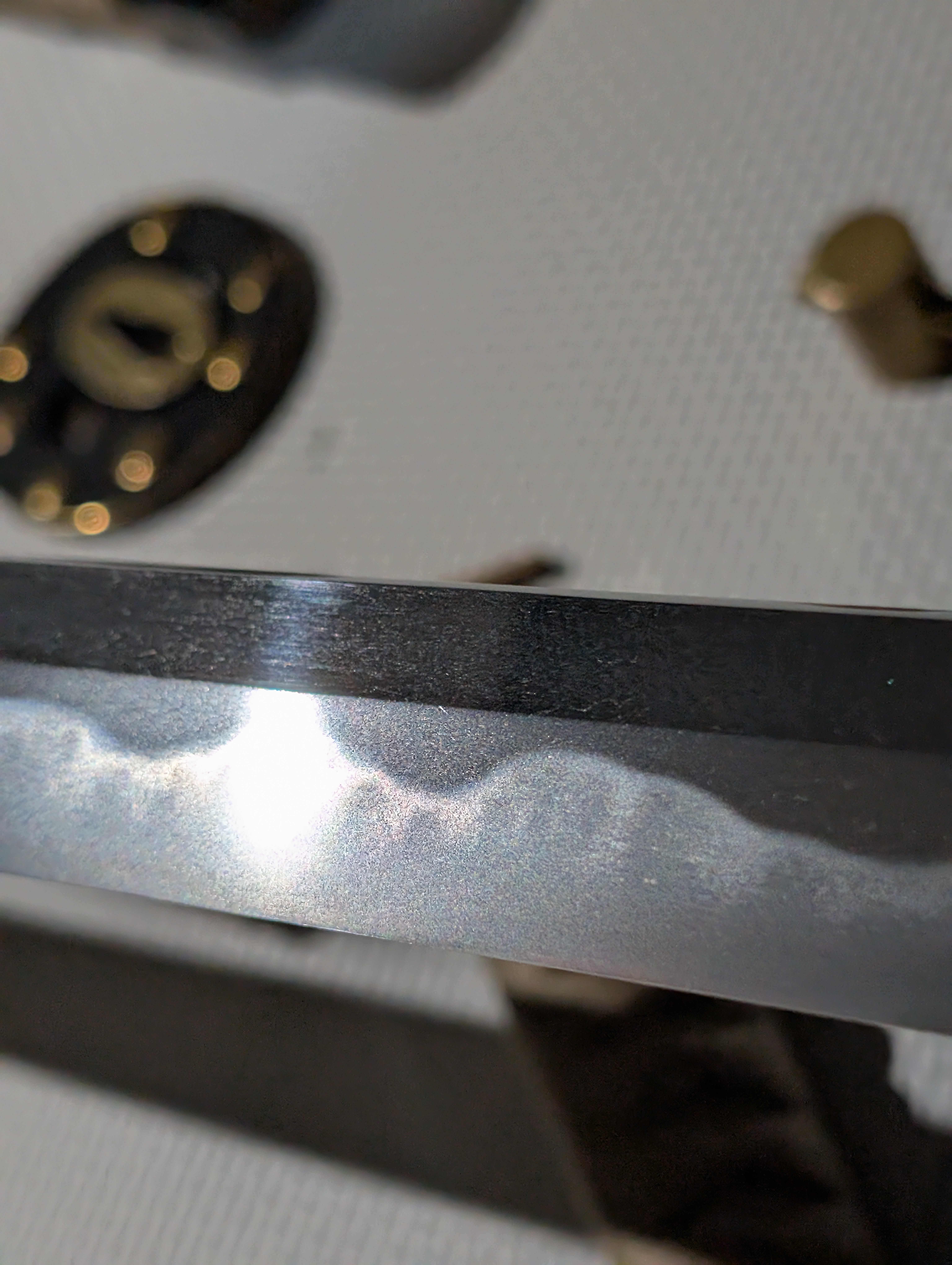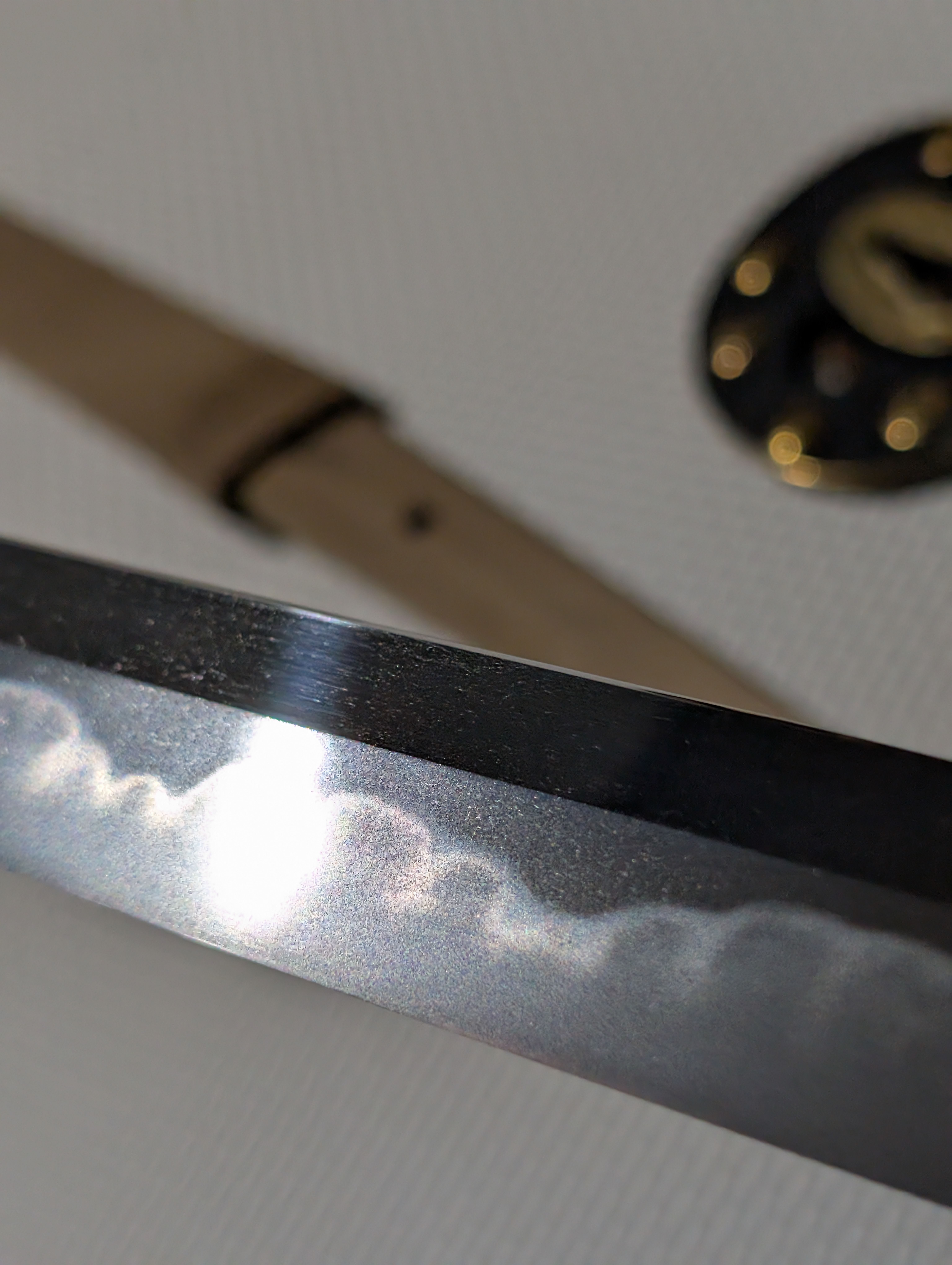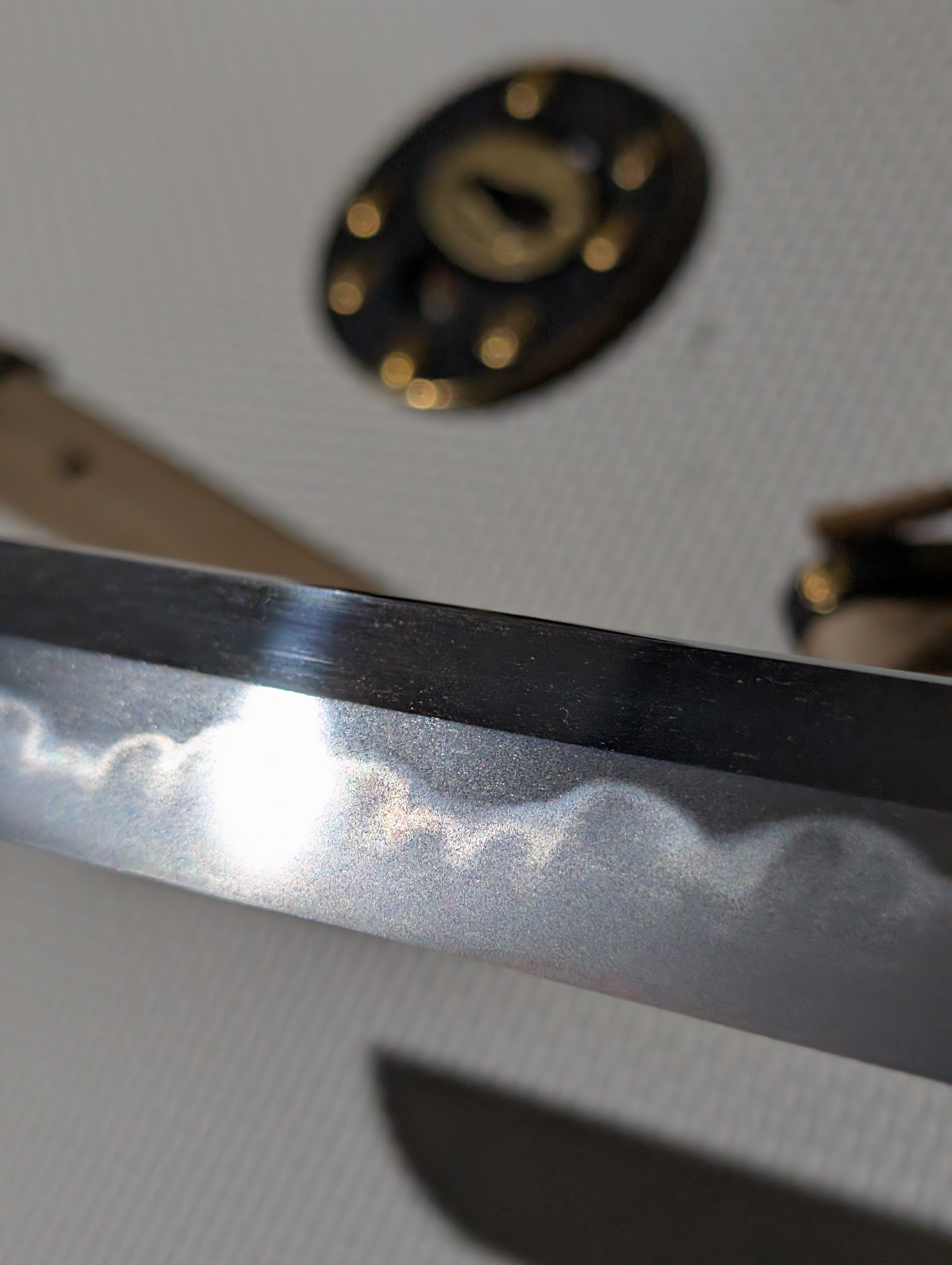 The blade’s shape is in shinogi-zukuri, with an iori-mune. This is the most prevalent blade geometry in Japanese swords, originating in the early Heian Period and remaining in use today. Unlike many of the blades of the early Edo Period, this blade maintains a more classical style, foregoing elaborate carvings to instead allow the workmanship of the steel to speak for itself.