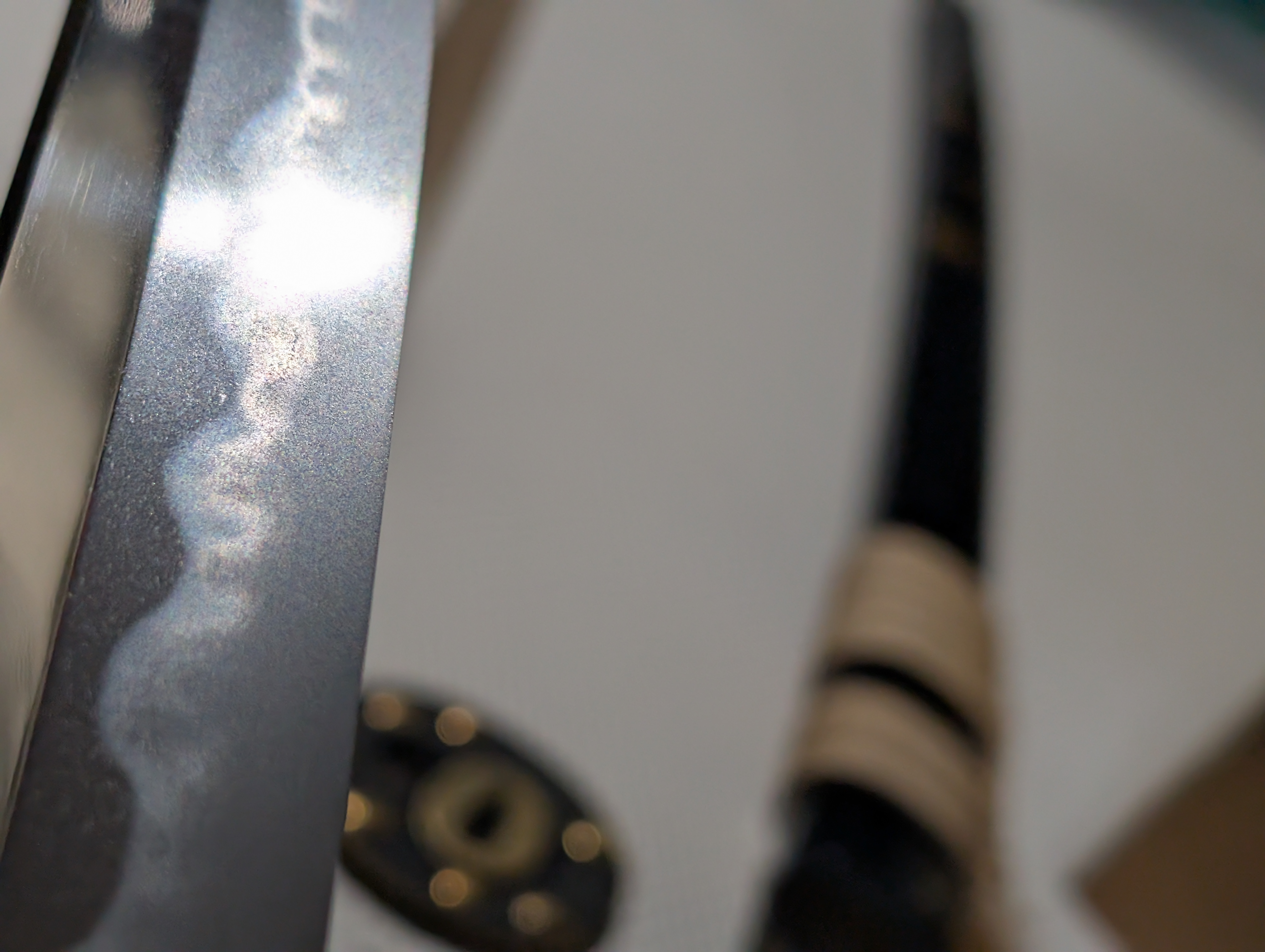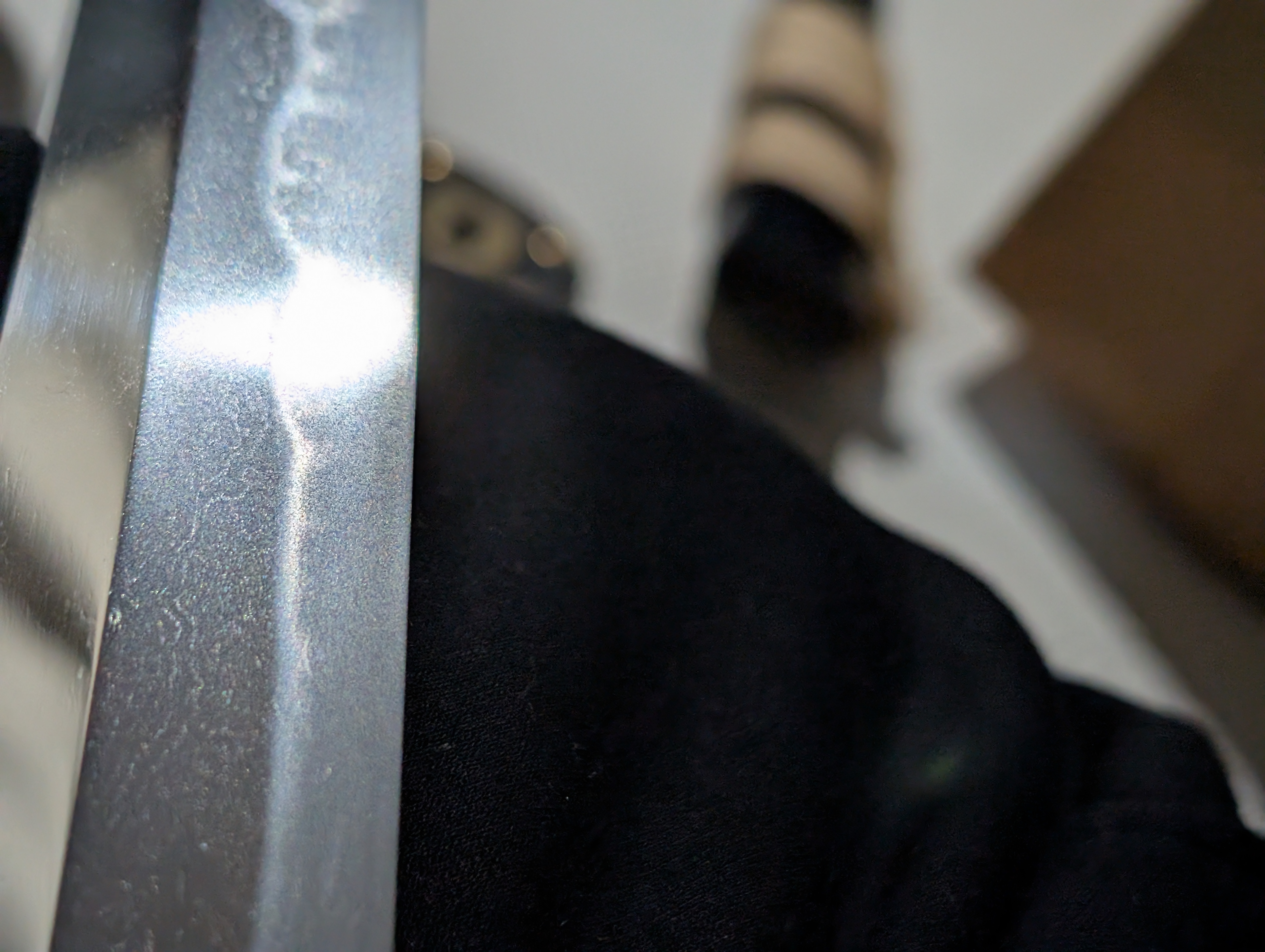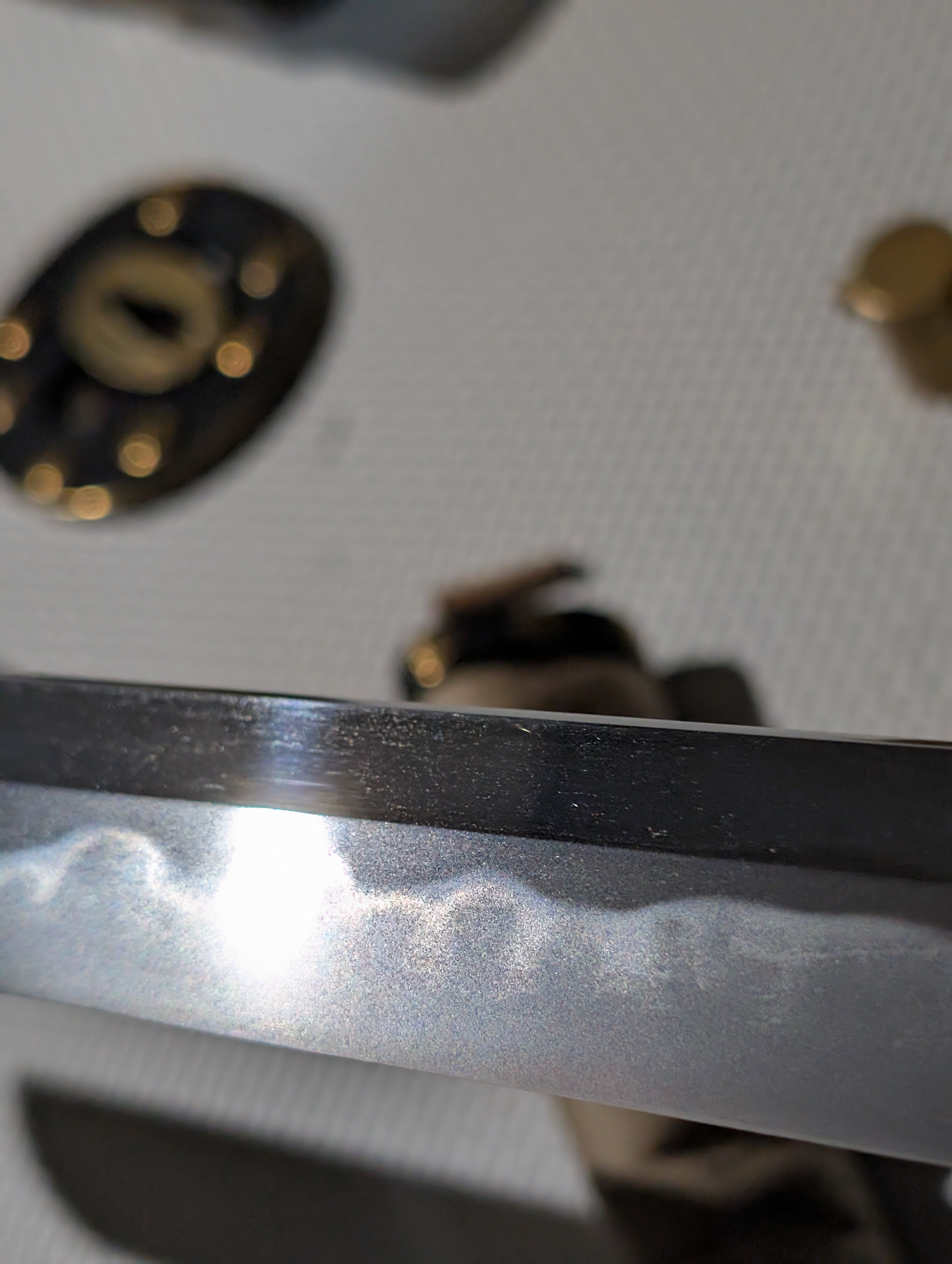 The blade’s shape is in shinogi-zukuri, with an iori-mune. This is the most prevalent blade geometry in Japanese swords, originating in the early Heian Period and remaining in use today. Unlike many of the blades of the early Edo Period, this blade maintains a more classical style, foregoing elaborate carvings to instead allow the workmanship of the steel to speak for itself.