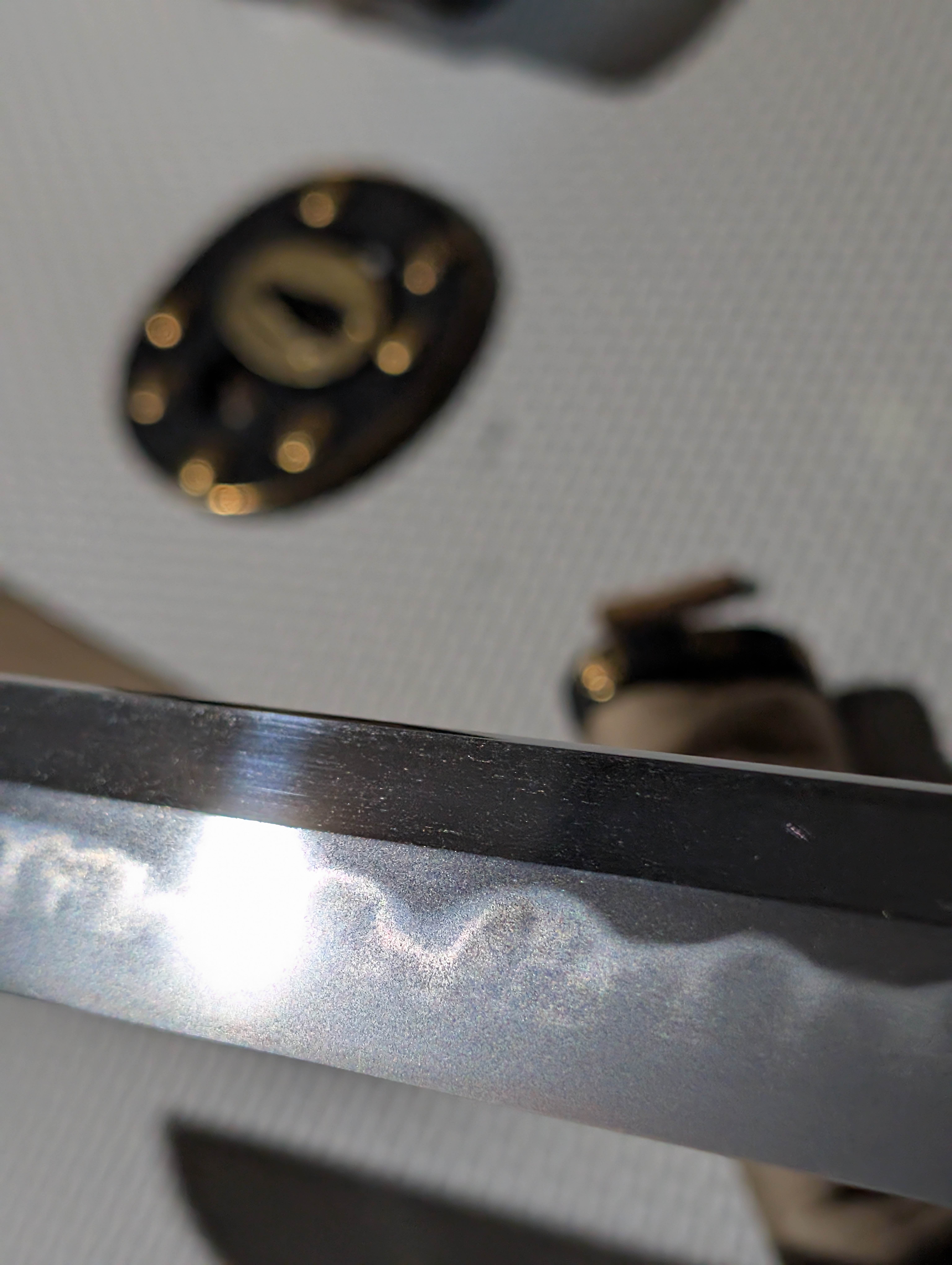 lacquer depictions of the “Aoi” (three-leafed hollyhock) crest used by the Tokugawa Clan, implying that the previous owners of this blade held a close relationship with the shogunate. This is only reinforced when looking at the kodogu of the tsuka, which are luxurious shakudo-nanako fittings with gold inlaid outlines of the same crest, besides the menuki, which are instead cast from solid gold. Finishing the already gauche set of fittings is a tsuba in the same shakudo-nanako as the fuchi and kashira, including multiple examples of the same Aoi crest in gold.