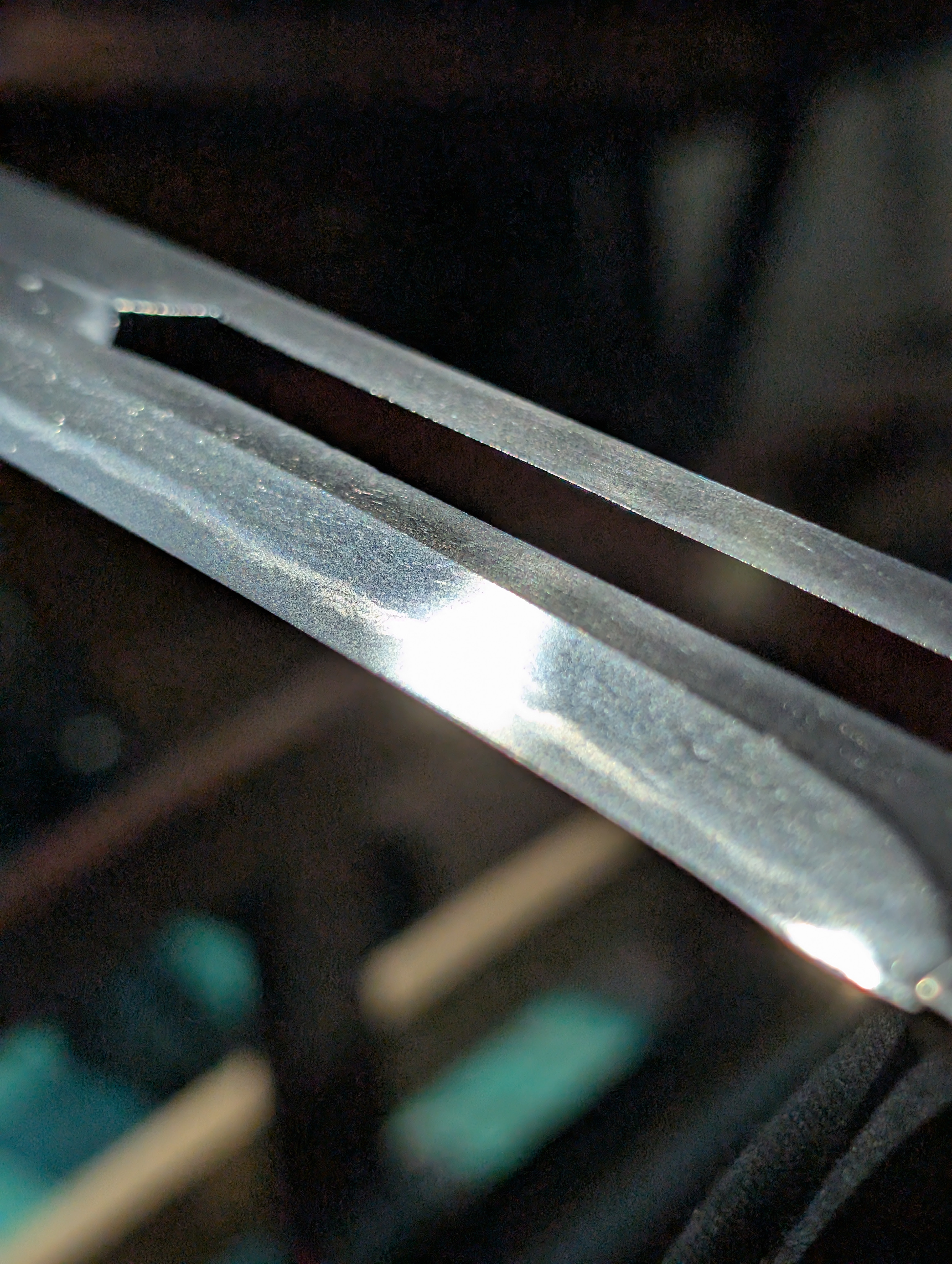 The blade’s shape is in shobu-zukuri, with an iori-mune. Although seen on swords, this style of geometry is most commonly seen on naginata, such as this particular example. Early examples of such work can be found in the late Heian Period, with the most famous example being a naginata allegedly owned by Musashi-Bou Benkei, held at Oyamazumi Shrine. As battlefield combat ended with the coming of the peaceful Azuchi-Momoyama and Edo Periods, such a work is particularly rare, only being elevated through the inclusion of a rare sukashi-bori (openwork) carving of a Buddhist vajra sword.